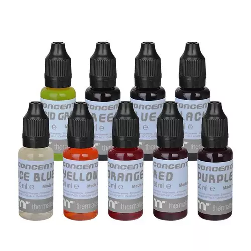 Specially designed for Thermaltake C1000 Opaque Coolant White/C1000 Pure Clear Coolant, the TT Premium Concentrate Series is ready-to-mix, anti-corrosion concentrate for coolant color-up in liquid cooling systems. Virtually odorless and non-flammable, the concentrate offers superb protection for copper, nickel, brass, and aluminum. Coming with 9 vivid colors to choose from (ice blue, blue, red, green, acid green, orange, yellow, purple and black), TT Premium Concentrate Series suits all water cooling systems and brightens up all builds with the excitement of color mix & match.