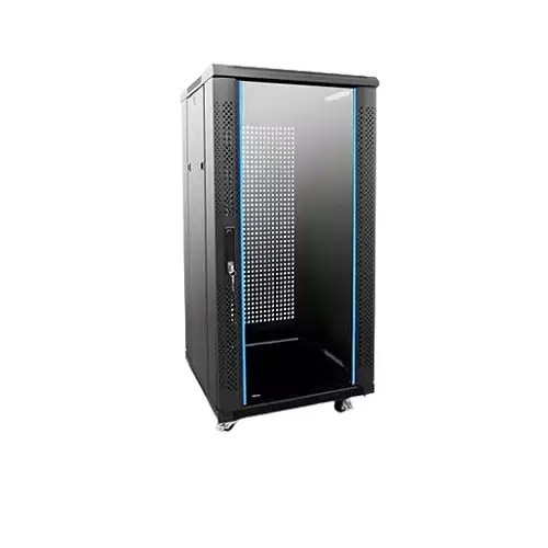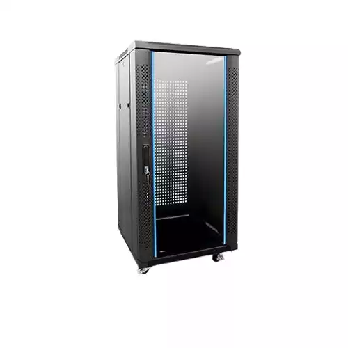 TOTEN G7.6622.9801 22U floor stand server cabinet has 600 x 600 mm depth, front glass door and back vented door with spring lock, 1 x 2 cooling fan, 1 x fixed shelf, 1 x 6 way PDU, 4 heavy-duty wheels, included necessary screw and wrench.