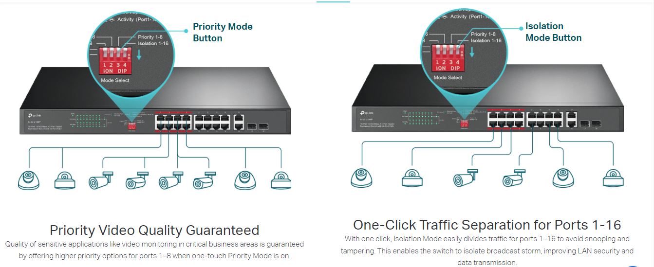 Quality of sensitive applications like video monitoring in critical business areas is guaranteed by offering higher priority options for ports 1–8 when one-touch Priority Mode is on.