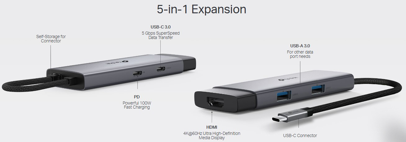 TP-Link UH5020C features a USB Type-C connector with five ports to meet all your connectivity needs. It includes a 4K@60Hz HDMI port for crystal-clear video output, a 100W Power Delivery (PD) port for fast charging, one USB Type-C 5Gbps port, and two USB Type-A 5Gbps ports for high-speed data transfers. Compatible with various operating systems, including Mac OS, Windows, Linux, iPadOS, iOS, Android, and Chrome OS, this hub ensures universal usability. With a durable aluminum alloy case, 180mm braided cable, and compact dimensions of 4.26 × 1.57 × 0.48 inches, the UH5020C is built for long-term performance and portability.
