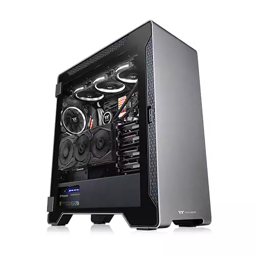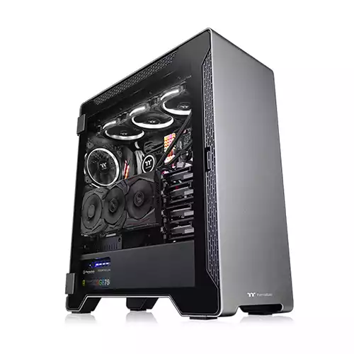 Thermaltake A500 Aluminum Tempered Glass Edition mid-tower chassis features a sleek aluminum front panel, two 4mm tempered glass panels, two pre-installed 120mm front fans and a 120mm rear fan for optimal system ventilation. It has a built-in power supply cover for clean and easy cable management and also supports up to a standard ATX motherboard. Accommodating the latest PC hardware including the most advanced graphic cards and air/liquid cooling solutions, the A500 Aluminum TG is designed for those who are looking for a chassis with outstanding thermal performance that is further complemented by a clean and simply designed case.