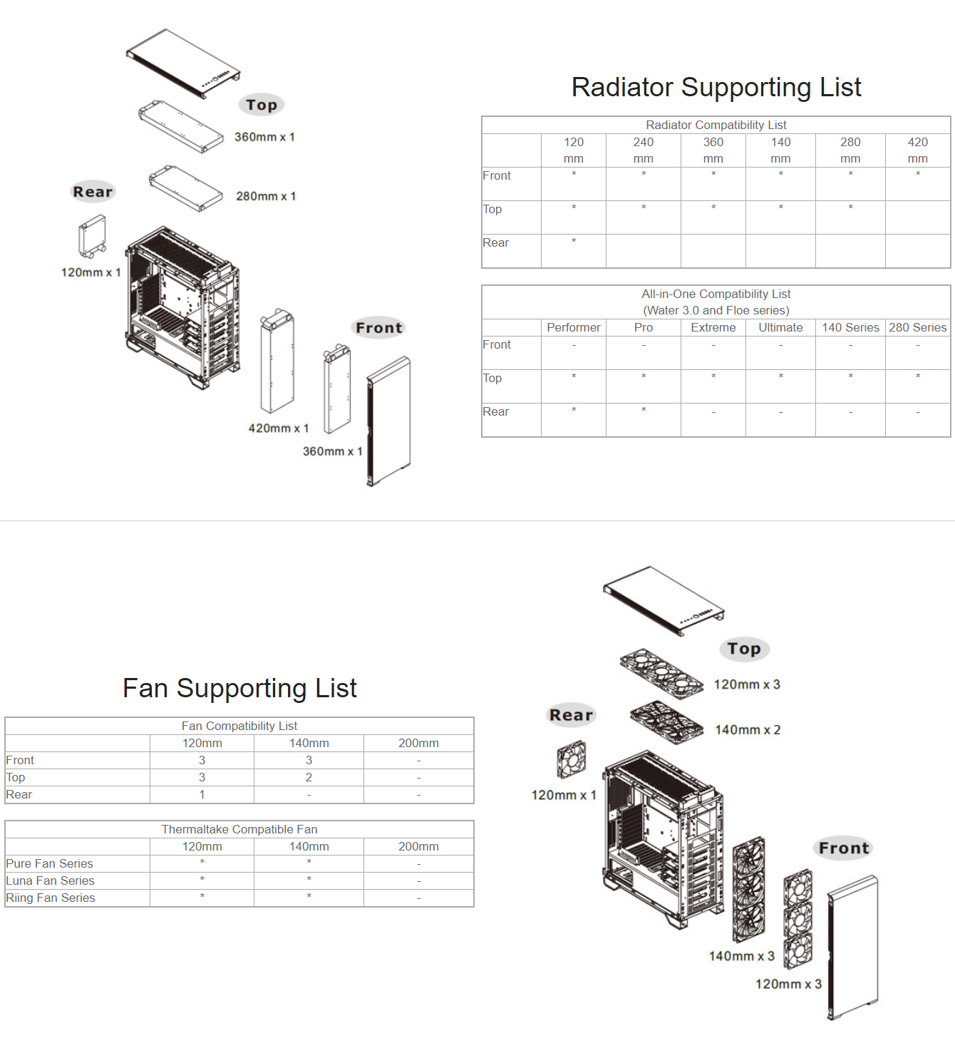 RADIATOR SUPPORT ●︎ Front:1 x 360mm , 1 x 420mm ●︎ Top:1 x 360mm , 1 x 280mm ●︎ Rear:1 x 120mm ●︎ Right:1 x 360mm (Without HDD Rack) |