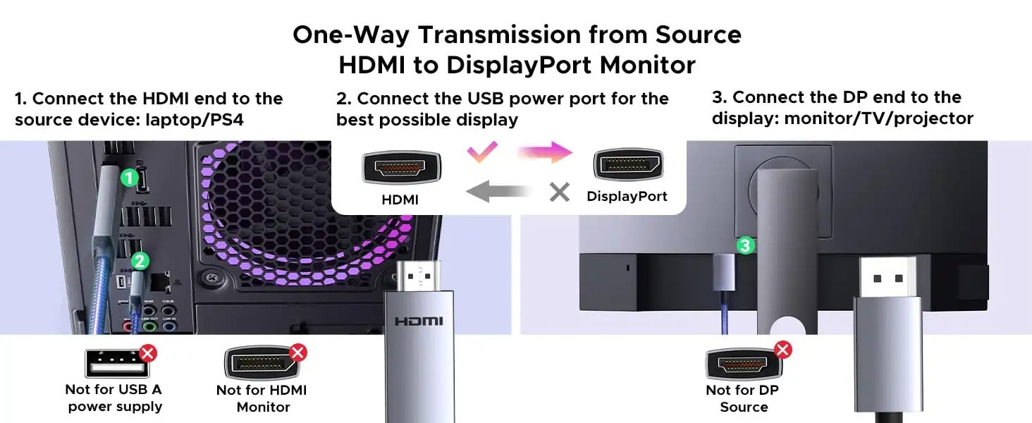 UGREEN HD169 (55329) 2M 4K HDMI to DisplayPort Cable is a premium active cable designed to connect HDMI-enabled devices to DisplayPort displays with full 4K UHD resolution at 60Hz. Perfect for gamers, streamers, and professionals, it supports HDR10, 3D content, and is fully backward compatible with lower resolutions including 2560×1440 and 1920×1080. This active cable includes a USB-A power connector to ensure stable signal transmission, while its built-in chipset located on the HDMI port guarantees smooth performance across all devices. Supporting a bandwidth of 21.6 Gbps, it delivers RGB and YCbCr video formats along with high-fidelity audio, including LPCM, AC-3, DTS, Dolby TrueHD, and DTS:X. Compatible with Windows, macOS, and Linux, the UGREEN HD169 works with PCs, laptops, Xbox, PlayStation, Steam Deck, and Nintendo Switch. Built with a durable PVC fire-retardant wire and aluminum alloy shell, it ensures long-lasting reliability and stable performance. No driver installation is required, making setup quick and easy for home, office, or gaming use.