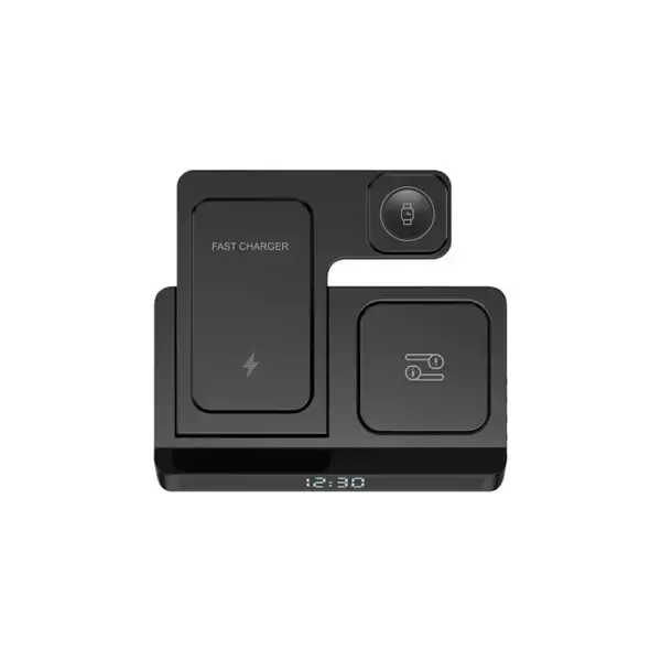 WiWU Wi-W006 15W 5-in-1 Wireless Charger is a versatile and efficient charging station designed for users who need to charge multiple devices simultaneously. This all-in-one charging solution supports fast wireless charging for smartphones, AirPods, and smartwatches, making it a perfect accessory for Apple and other wireless charging-compatible devices. With its sleek design, built-in ambient light, clock, and alarm function, it offers both convenience and style, making it a must-have gadget for home or office use.